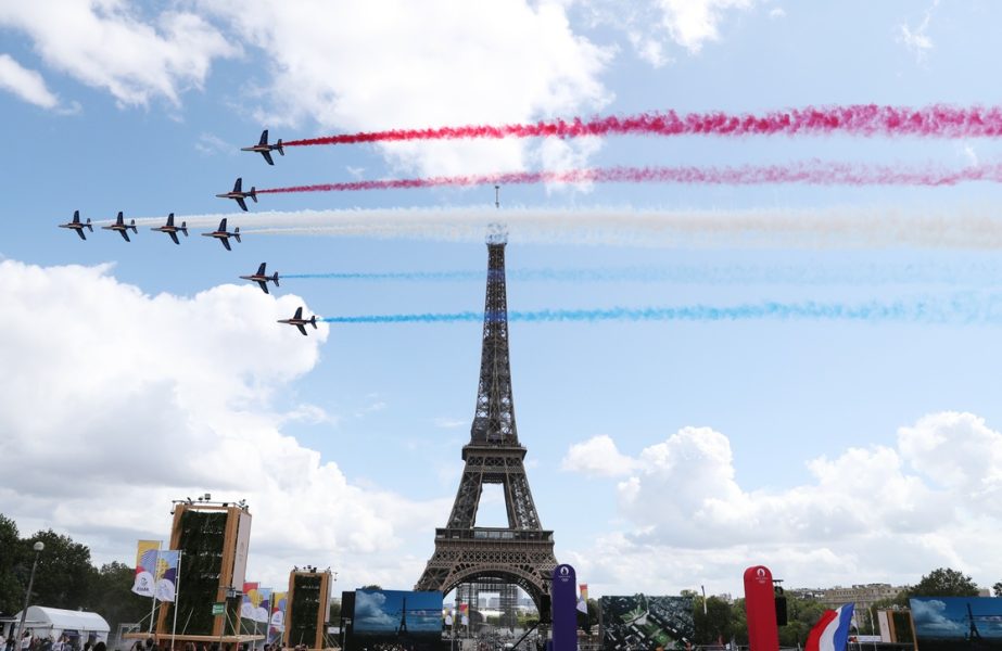 Estaba previsto el despliegue de una bandera gigante (90 metros de largo por 60 de ancho, para una superficie de 5 mil 400 metros cuadrados) con el logo de París 2024, pero las condiciones meteorológicas hicieron que no pudiera realizarse en el momento planeado y la imagen de la emblemática Dama de Hierro luciendo ante el mundo como un mástil de lujo fue virtual.