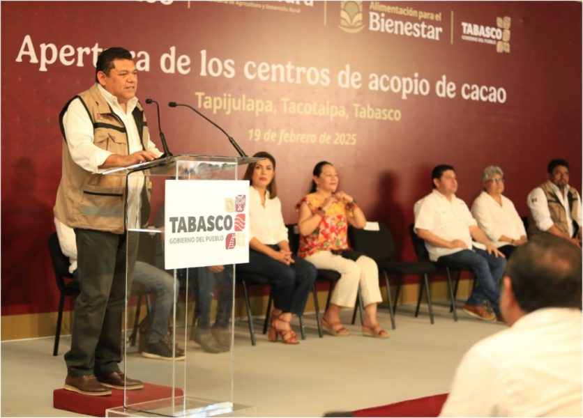 El gobernador de Tabasco, Javier May Rodríguez, encabezó junto a María Luisa Albores González, directora general de Alimentación para el Bienestar, la apertura del Centro de Acopio de Cacao “Alimentación para el Bienestar” en Tapijulapa, Tacotalpa.